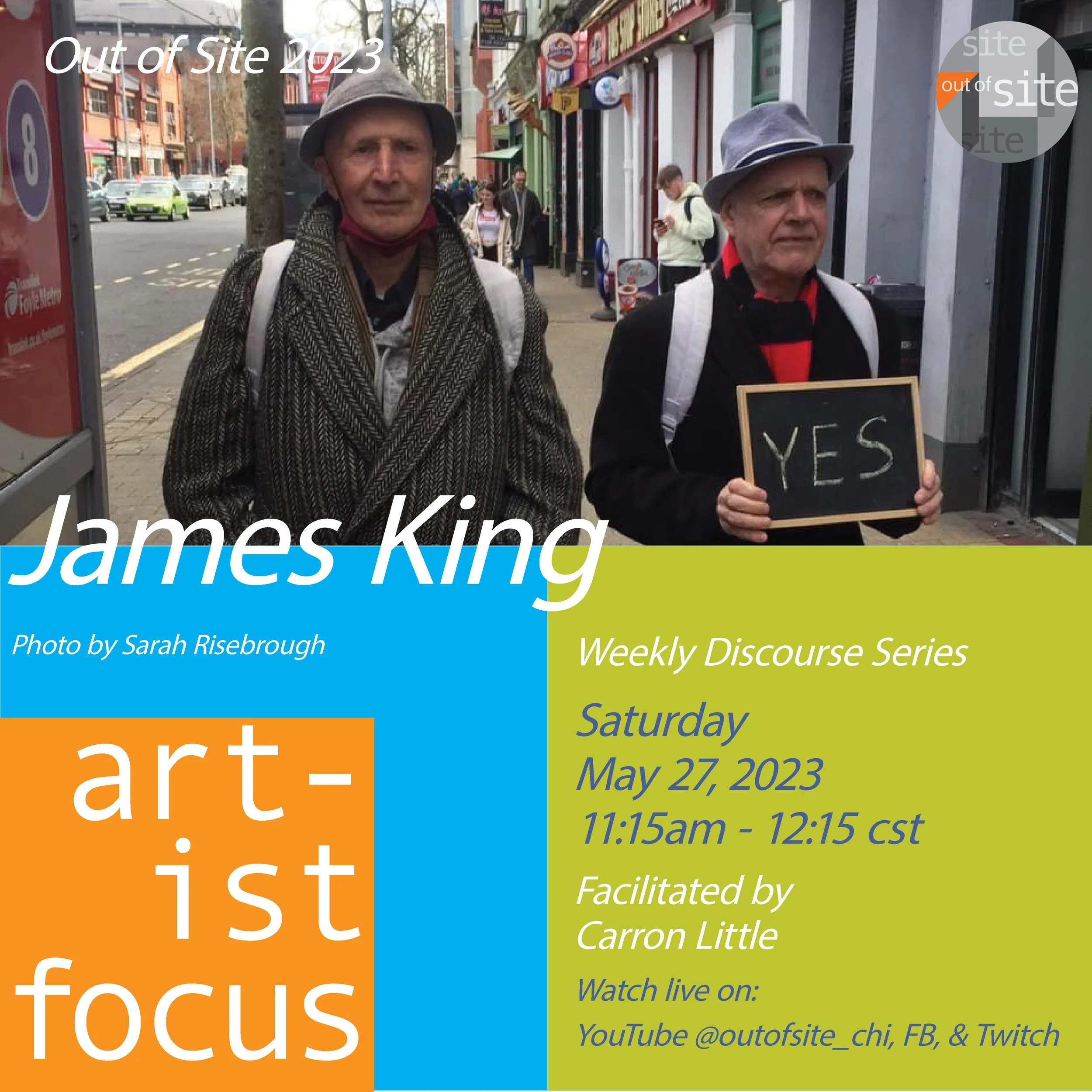 Facilitated by Carron LittlePhoto by Sarah RisebroughOn Saturday May 27 @11:15am ct | 18:15 ect Carron Little was in conversation with James King about his public performance art takeovers working through the Troubles in Belfast and Derry in N.Ireland to the present time. He works collaboratively with many artists in public space and has had a long-term collaboration with Eamonn O’Donnell creating public interventions over three decades. James King was a workshop facilitator at Flow 2021 where we learnt to fuse poetics, vocality with public performance actions. The humor evoked in his work through poetry and performance art is a important element in his practice. Please note we decided to create a Part 2 that was recorded on May 31, 2023 and can be listened to here: Artist Focus with James King Part 2